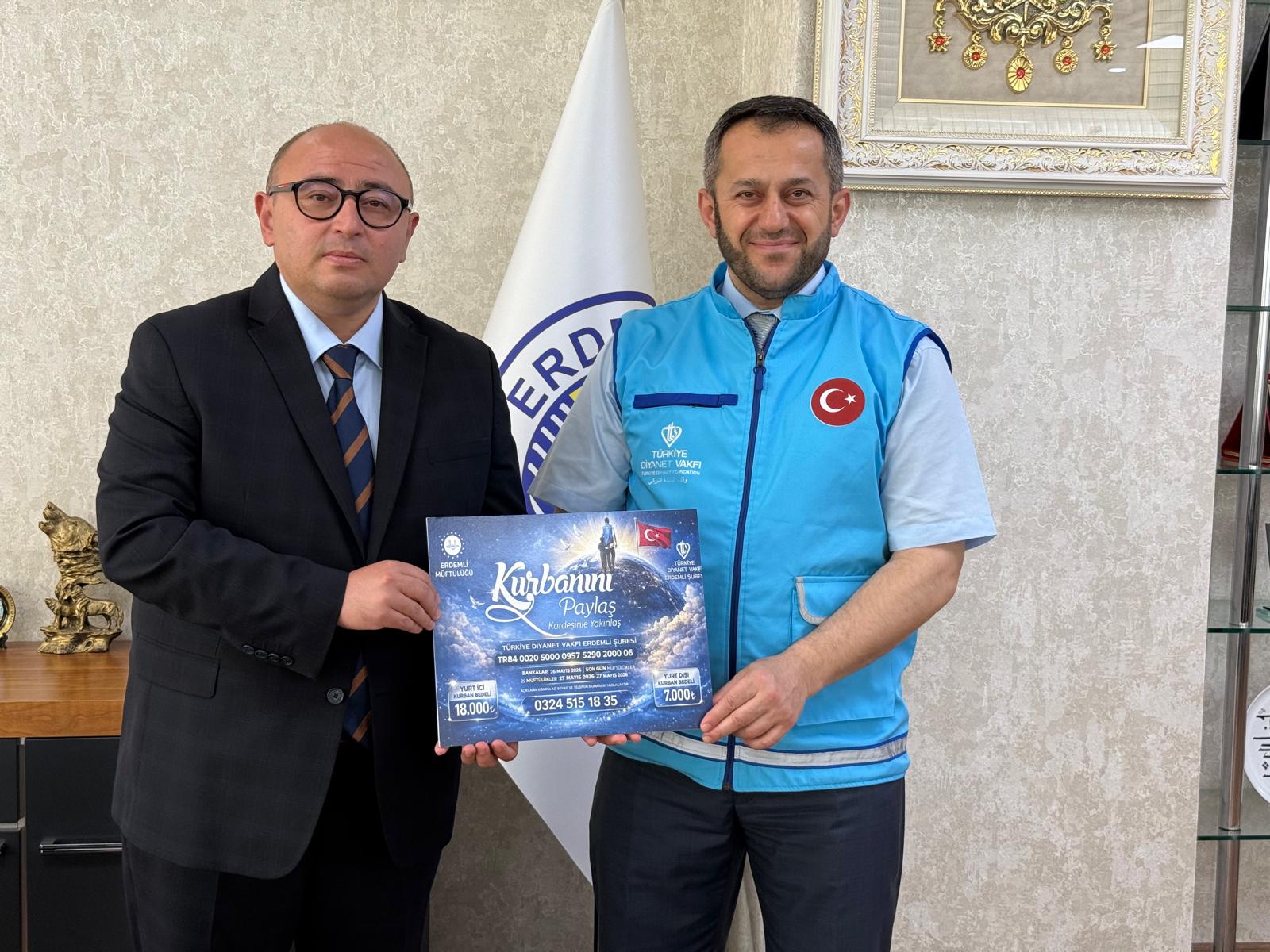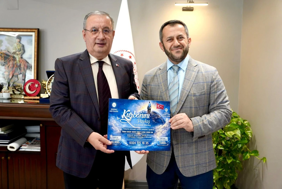 Erdemli İlçe Müftüsü İbrahim Yiğit vekaletle kurban bağışı kampanyası kapsamında Erdemli Kaymakamı Aydın Tetikoğlu, Erdemli belediye Başkanı Mustafa Kara ve protokol üyelerini ziyaret ederek onların bağışlarını almaya başladı.