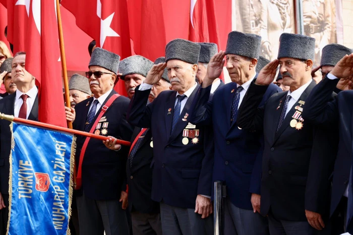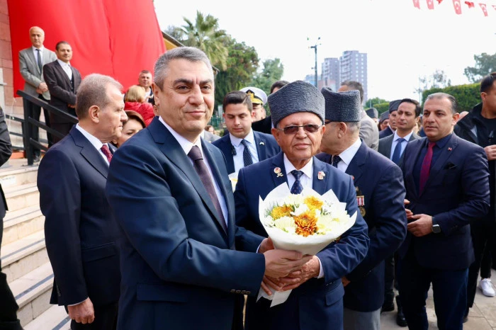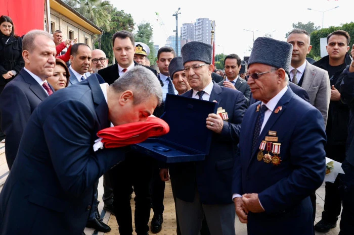 Programda Valimiz Sayın Atilla Toros, Muharip Gaziler Derneği Başkanı Kemal Gülbeyaz’ın takdim ettiği Türk Bayrağı’nı teslim aldı. Valimiz Atilla Toros, beraberinde Garnizon Komutanı Vekili Tuğamiral Korkut Şen, Büyükşehir Belediye Başkanı Vahap Seçer tarafından Gazilere çiçek takdim edildi.