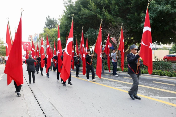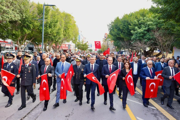 Valimiz Atilla Toros ve il protokolü; gaziler, öğrenciler ve vatandaşların katılımıyla, Tren Garından çıkarak İstiklal Caddesi üzerinden Cumhuriyet Meydanı’na doğru kortej halinde yürüyüş gerçekleştirdi.