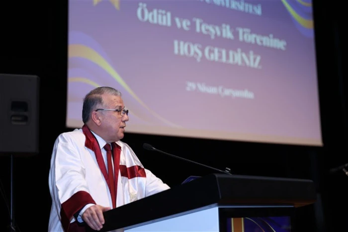Törenin açılışında konuşan Rektörümüz Prof. Dr. Erol Yaşar, Üniversitemizin sürekli yükselen akademik başarı grafiğine dikkat çekerek, "Bir üniversiteyi büyük ve köklü kılan değer; o kurumun çatısı altında ter döken, üreten, bilimi ve toplumu ileriye taşımayı dert edinen insan kaynağımız. Bugün burada sergilediğimiz bu muazzam tablo, personelimizin ve öğrencilerimizin Üniversitemize duyduğu o güçlü aidiyet duygusunun ve ortak çalışma kültürümüzün en güzel meyvesi. Göreve geldiğimiz günden bu yana 'kalite odaklı' ve 'sürekli iyileştirme' prensibiyle hareket ediyoruz. Ne mutlu bizlere ki, Üniversitemizin akademik başarı grafiği her geçen gün daha da yukarı ivmeleniyor. Birçok bölümümüzün akreditasyon süreçlerini başarıyla tamamlaması ve kalitelerini tescillemesi bizler için büyük bir gurur kaynağı. Bu kalite yolculuğumuzun en önemli nişanesi ise YÖKAK tarafından Üniversitemize layık görülen 2 yıllık Kurumsal Akreditasyon belgesi oldu." dedi.