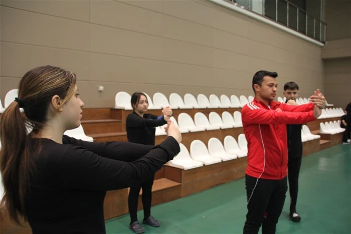Sporcular milli takım antrenörleri Rahim Türk ile Enes Buğra Yayla nezaretinde antrenmalarını sürdürüyor.
